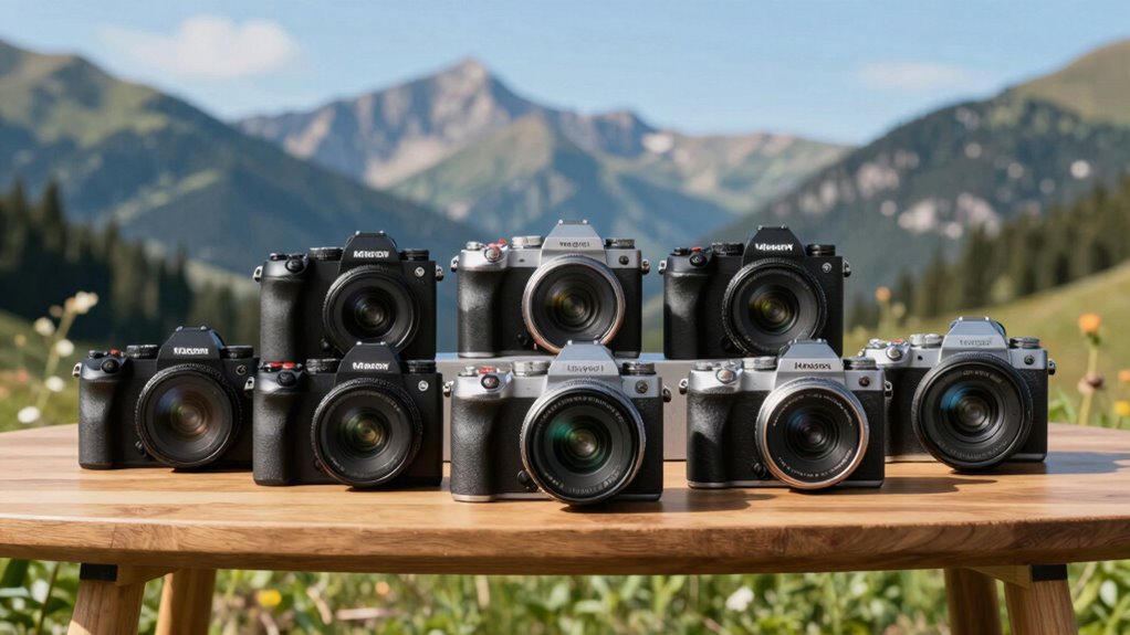Choosing the right mirrorless camera for travel depends on your needs. For example, I once took my OM SYSTEM OM-5 Mark II on a mountain trek, and its compact size and versatile lens made capturing stunning landscapes effortless. Whether you prioritize portability, image quality, or features, selecting a camera that fits your travel style guarantees you’ll preserve those unforgettable moments vividly. So, consider your adventures, and pick the one that’ll be your perfect travel companion.
